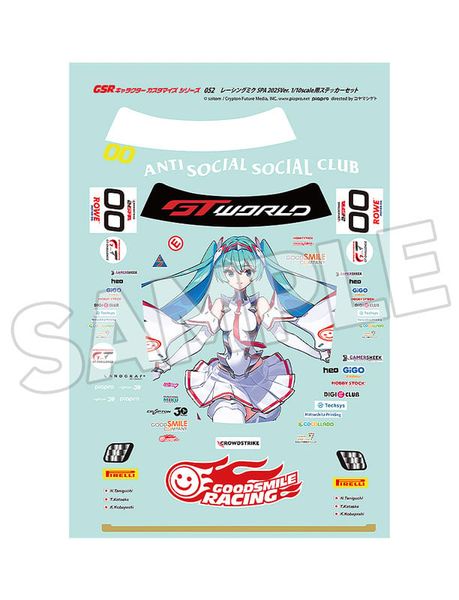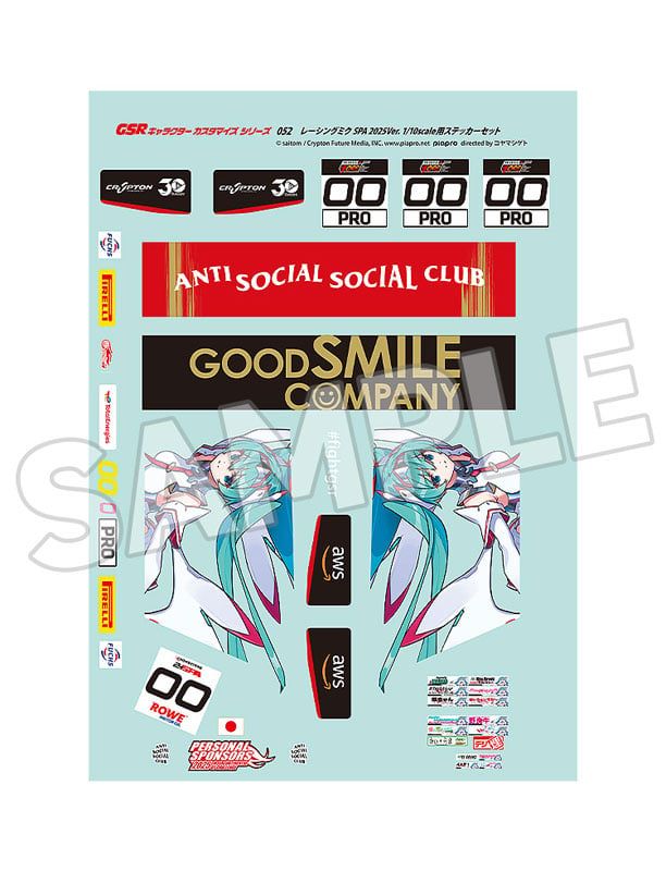 The GSR Character Customization Series 052: Racing Miku SPA 2025 Ver. 1/10 Scale Sticker Set is an official product from Good Smile Racing, a brand renowned for its racing-themed merchandise and Hatsune Miku collaborations. Specifically designed for 1/10 scale radio-controlled cars, this sticker set allows fans to recreate the iconic Racing Miku designs from both the 24 Hours of Spa-Francorchamps and Suzuka 1000km races within the Vocaloid Series. It's the perfect choice for personalizing your RC car with the unique style of Hatsune Miku, blending your passion for racing with your love for the beloved virtual idol.