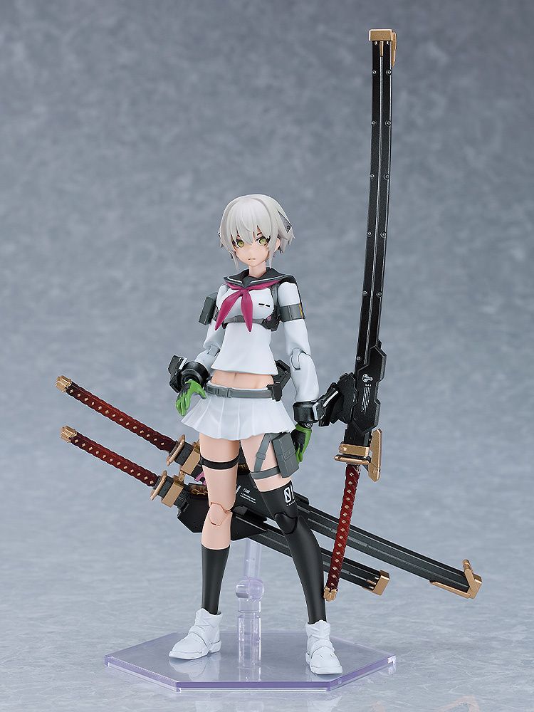 This plastic model kit of Ichi Early Ver. from the Heavily Armed High School Girls series is produced by Max Factory under the PLAMAX line. The model stands approximately 16cm tall and features a renewed outfit and weapons designed specifically for this kit. It includes snap-fit connections for easy assembly and pre-painted parts such as the face plates, eyes, scarf, and sailor collar. The model comes with three large swords, two daggers, a stand, and various face plates including a standard, smiling, and masked face, all with movable eyes. Order is available at 9,900 JPY (discounted to 9,400 JPY), and the release date is set for January 2025. This kit is a perfect addition to any collection of Heavily Armed High School Girls or for fans of plastic model building.
