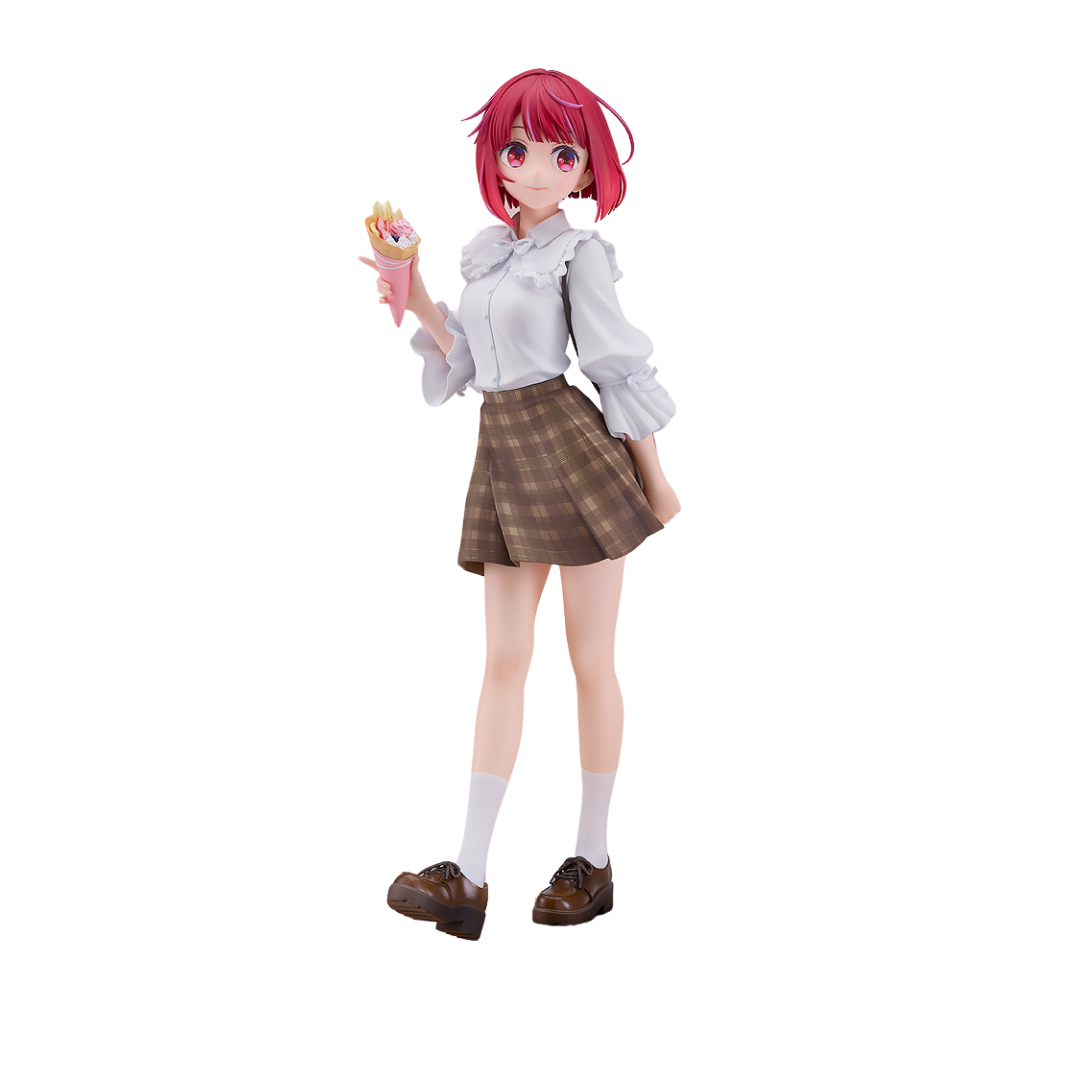 The Kana Arima Date Style Ver figure from the anime [Oshi no Ko] is produced by Good Smile Company. This 1/6 scale figure stands approximately 26 cm tall, capturing Kana in a casual and adorable outfit perfect for a fall date. Details such as her flowing hair, slender legs, and the crepe filled with fruits and ice cream in her hand are meticulously sculpted. The skillful paintwork highlights her hair and adds detailed textures to her outfit and accessories, making this figure truly captivating. The figure comes with a stand for stability, and is a must-have for fans of [Oshi no Ko] and Kana Arima. Set for release in October 2025, this figure is carefully packaged to ensure safe delivery.