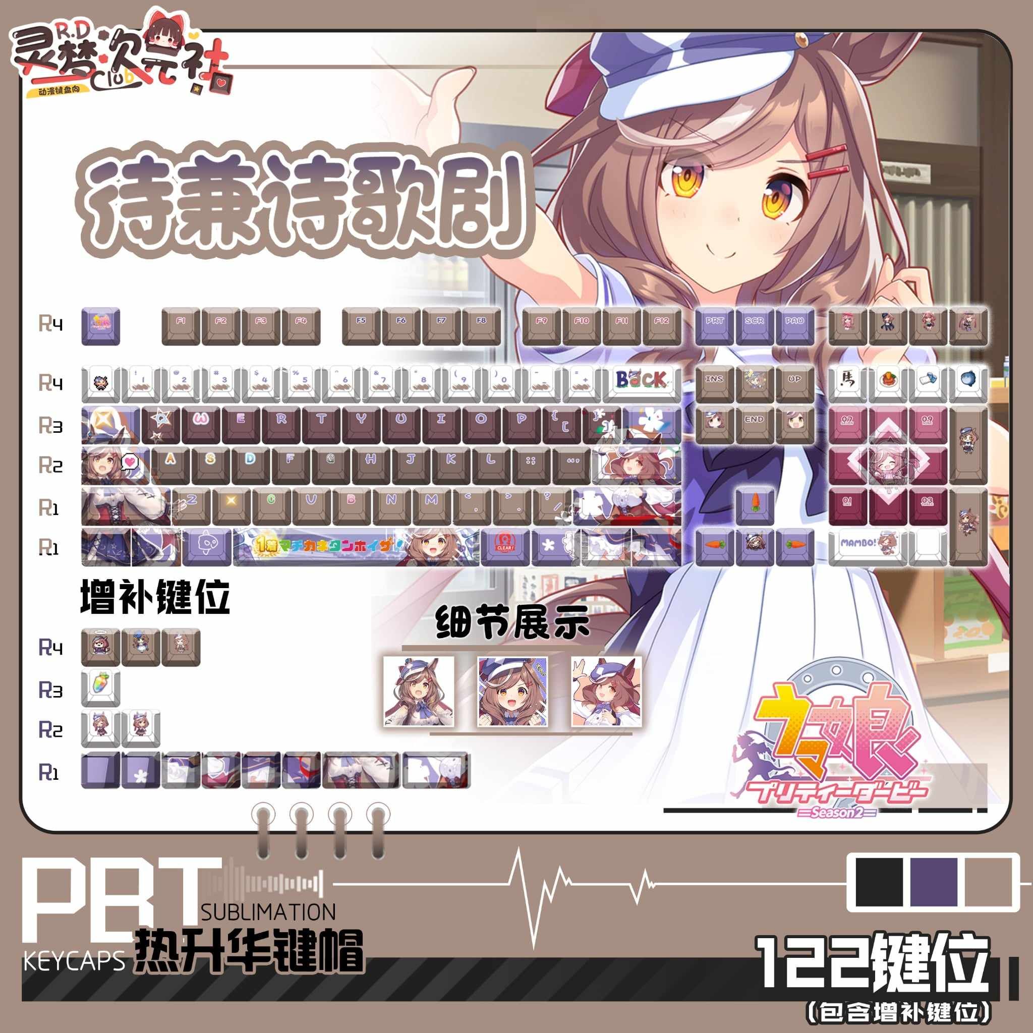 This keycap set features Matikane Tannhauser from Uma Musume Pretty Derby with PBT dye sublimated printing and 122 keys. It uses Cherry profile, supports ANSI and ISO layouts, and fits mechanical keyboards with Cherry-style stems. Extra novelty keys and a keycap puller are included, and the set also works well with RGB setups.