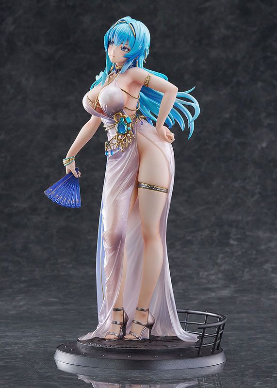The figure stands at approximately 265 mm including the base and is crafted from high-quality plastic. Helm's dress is carefully sculpted with smooth drapery and a graceful silhouette, highlighted by pearlescent paint and glitter for added radiance. Gold accessories accentuate her noble presence, while the deep dress slit reveals her legs, enhancing the sophisticated and alluring presentation.
