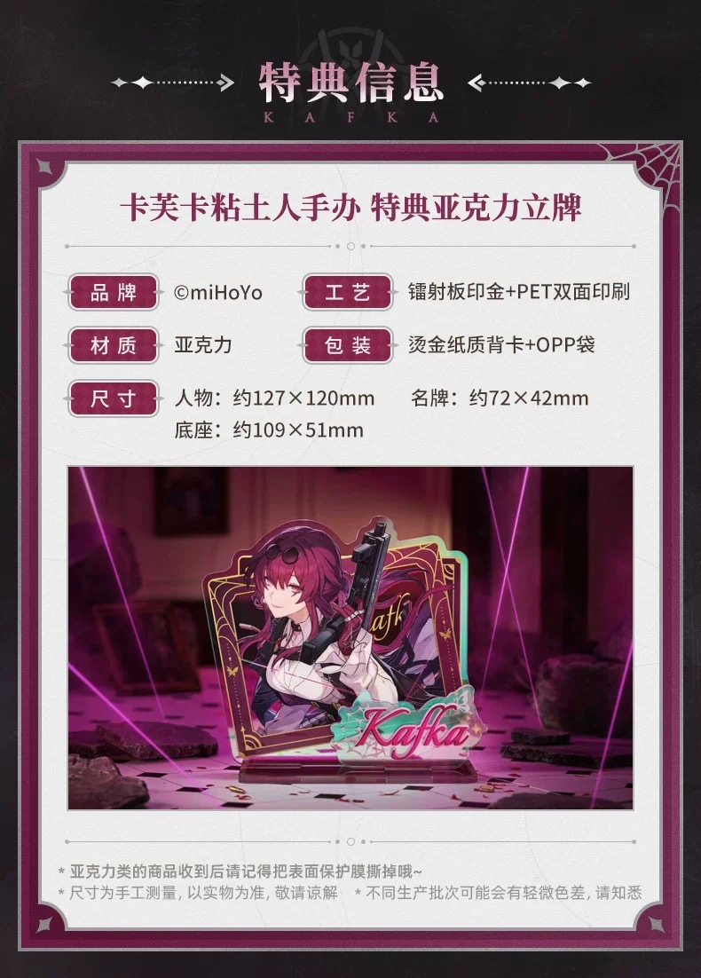 Figure có kích thước xấp xỉ 100mm, không theo tỉ lệ chuẩn (non scale), chế tác từ nhựa tổng hợp chất lượng cao, với từng mảng sơn và shading tỉ mỉ để giữ đúng tinh thần thiết kế của nhân vật. Bộ sản phẩm đi kèm nhiều mặt biểu cảm gồm mặt hiền, mặt nháy mắt và mặt mở miệng, cùng hai khẩu súng và phần thân thay thế để tạo dáng động. Phần đế đi kèm giúp figure đứng ổn định khi trưng bày. Với kích thước nhỏ gọn, Kafka Nendoroid thích hợp đặt trên kệ, bàn làm việc hoặc làm điểm nhấn trong tủ kính bộ sưu tập.