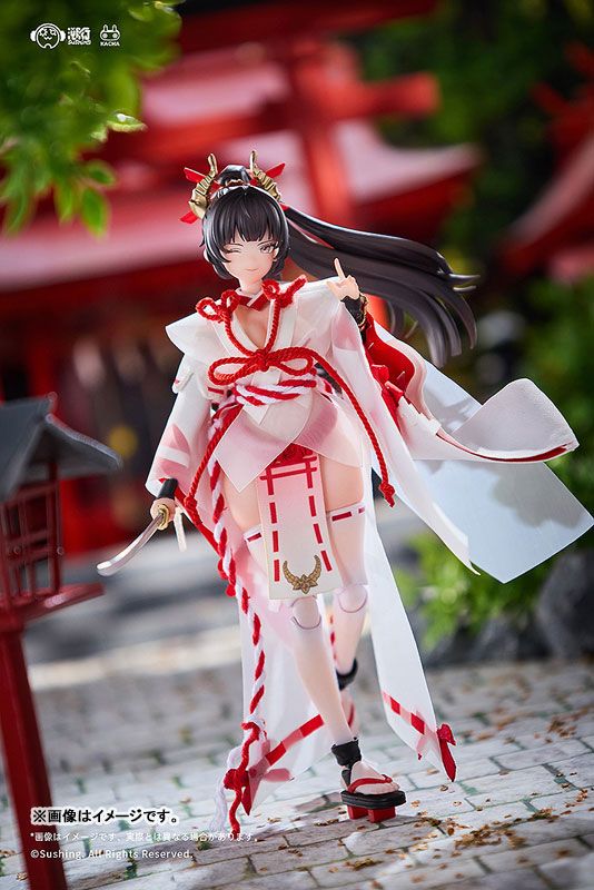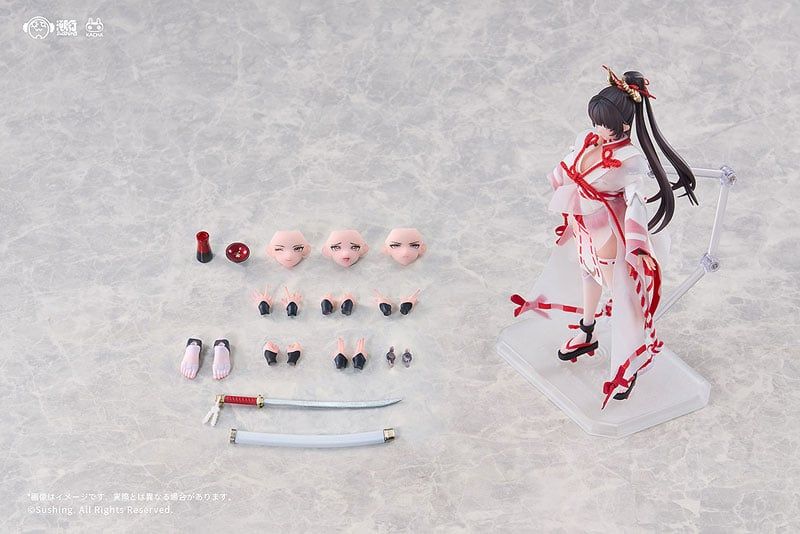 Authentic Sakura Uefuji from Sushing's "Combat Shrine Maiden" series in 1/12 scale, standing approx. 14.8cm tall. Made with PVC/ABS/POM with a real cloth outfit, featuring Sushing's KACHA joints for wide articulation. Includes 4 interchangeable face parts, multiple hand sets, and a first-press bonus interchangeable leg parts set for more display options.