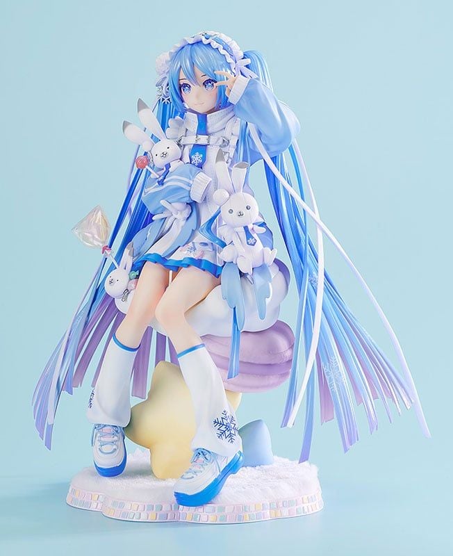 This 1/7 scale Snow Miku Yukiiro Pop Ver. figure by Good Smile Company features Hatsune Miku seated on a fluffy cushion, inspired by the Sky Town 10th anniversary illustration. Made of high-quality plastic with pearlescent hair, snow globe-like eyes, and adorable accessories such as Rabbit Yukine, it offers a charming display from every angle.